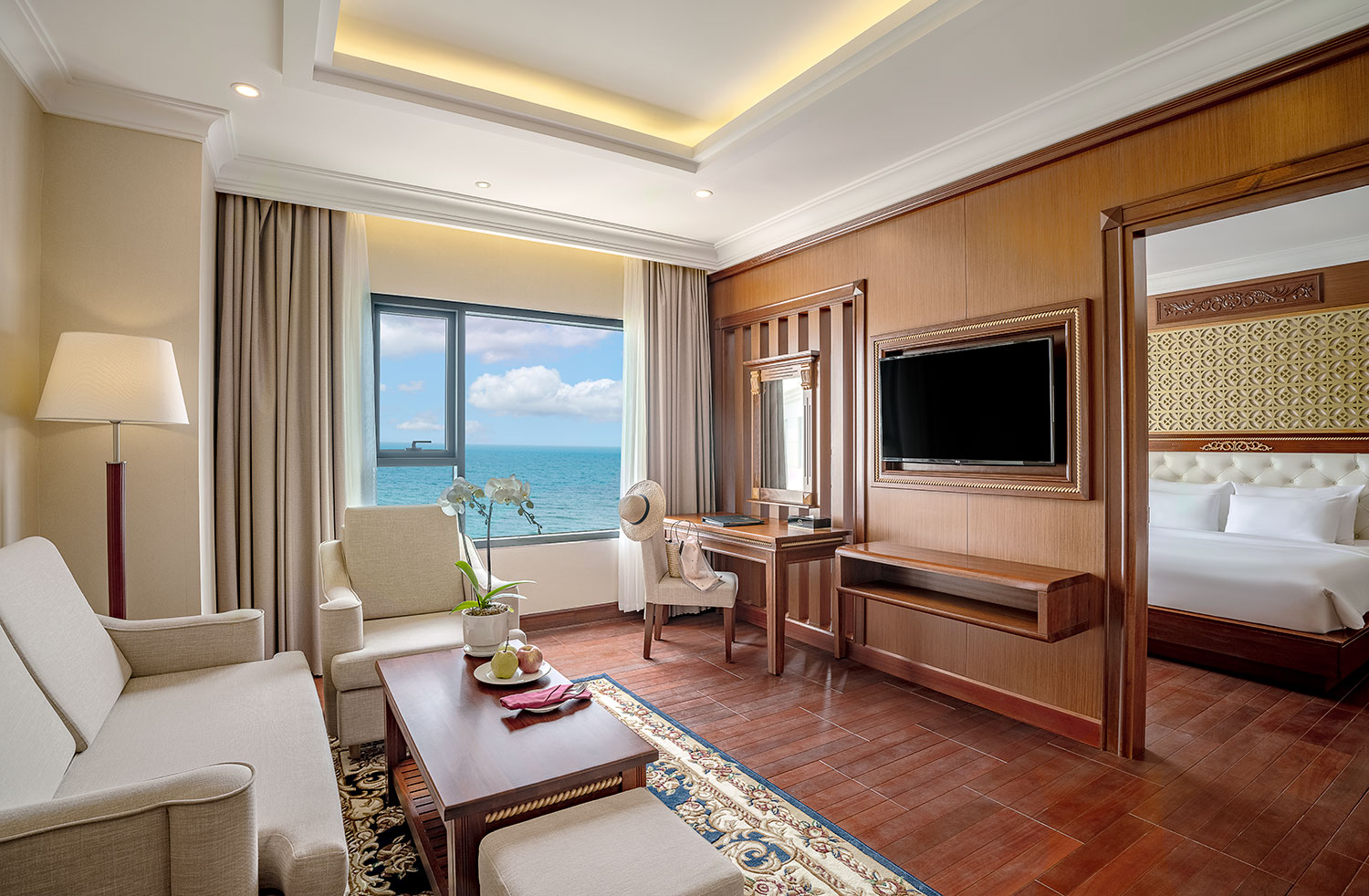 부드러운 백사장과 녹색 코코넛 나무 위로 밀려오는 바닷물과 함께 미케 해변의 탁 트인 전망을 제공하는 이그제큐티브 스위트 오션 프런트는 다낭의 아름다운 해안 도시에서 휴가를 보내기에 좋은 선택입니다.