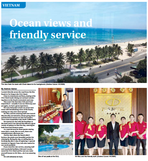 Trong bài viết mới nhất trên trang Travel Today, nhà báo Andrew Guiver đã chia sẻ về lần thứ ba anh chọn DLG Hotel Danang làm điểm dừng chân cho kỳ nghỉ của mình. Tọa lạc tại vị trí đắc địa ngay đối diện biển Mỹ Khê, DLG Hotel Danang không chỉ thuận tiện để khám phá ẩm thực địa phương mà còn mang đến những căn phòng hướng biển tuyệt đẹp, khiến Andrew vô cùng hài lòng.